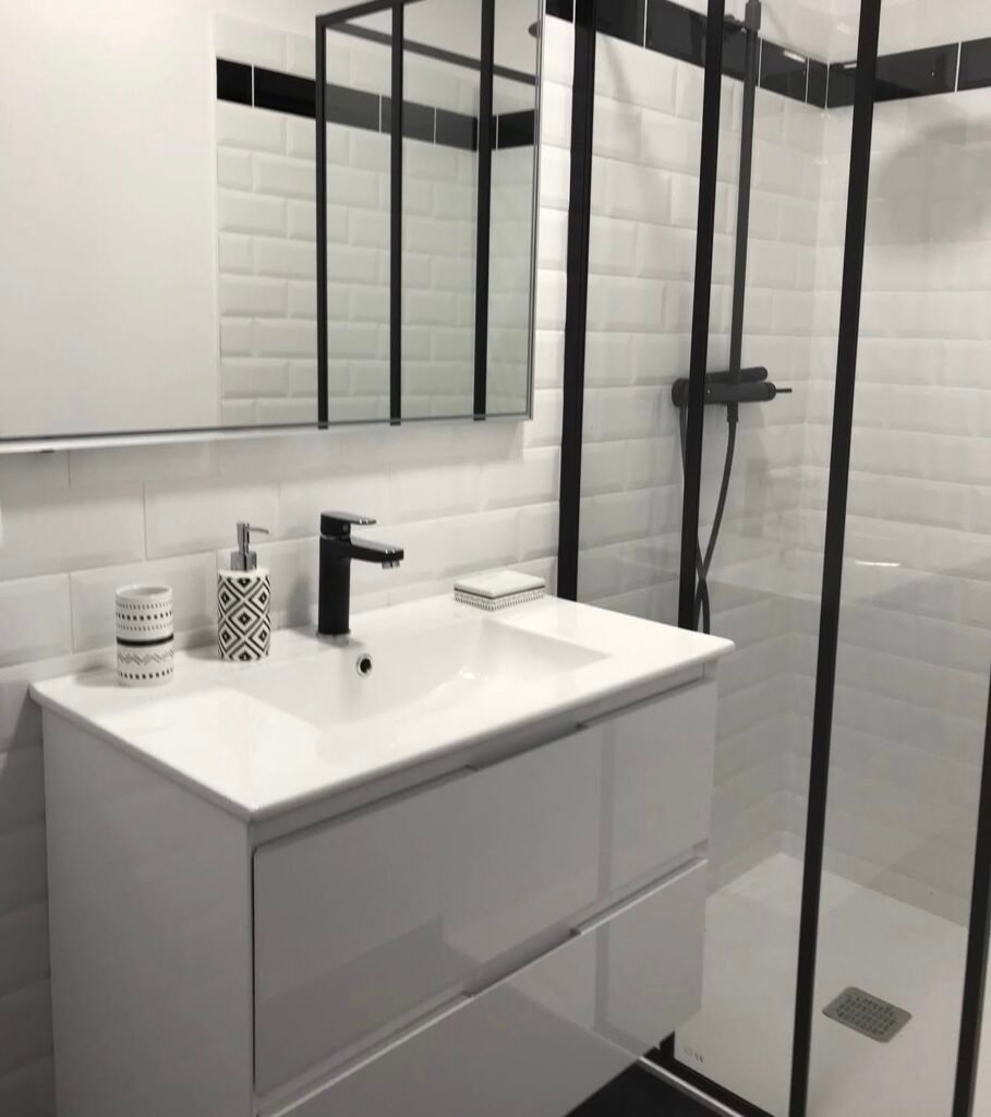 – Salle de bain (sol + faïence, douche, niches, etc.)